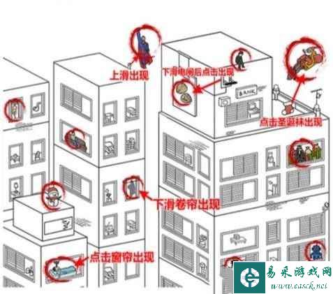 2、上滑楼顶的手可以找到超人,下滑电闸后出现核桃仁,旁边坐着炒股人