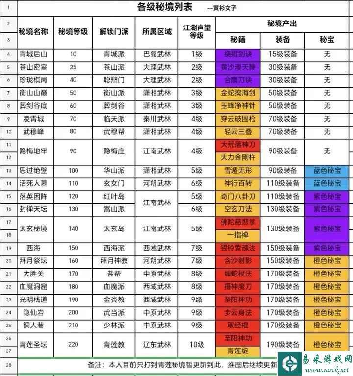 《我要当掌门》各级秘境开放地图以及产出明细1、青城后山 秘境等级:10 解锁门派:青城派 所属区域:巴蜀武林 江湖声望等级:1级 秘境产出: 秘籍:绕指剑诀 装备:15级装备 2、苍山密室 秘境等级:25 解锁门派:苍山派 所属区域:大理武林 江湖声望等级:2级 秘境产出: 秘籍:黄沙漫天鞭 装备:30级装备
