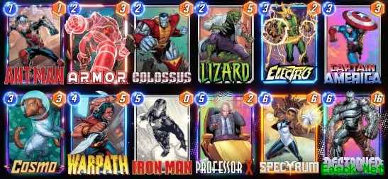 1.T1打蚁人T2铠>钢力士=蜥蜴,手里有狗可以优先打蜥蜴T3电王>科斯莫>美国队长,这回合出什么牌较为关键,还得根据现场实际情况进行抉择,手里有多张高费用牌时打电王。 2.二回合打了蜥蜴,3回合先手可以打狗,美队是备选。T4打真途,若3回合打了电王,这回合可以x教授锁或者打钢铁侠。 3.T5钢铁侠或者x教授,若之前打过电王可以打光谱,最后用毁灭者终结。 4.T6一般已毁灭者结束,单赢下一路。 |