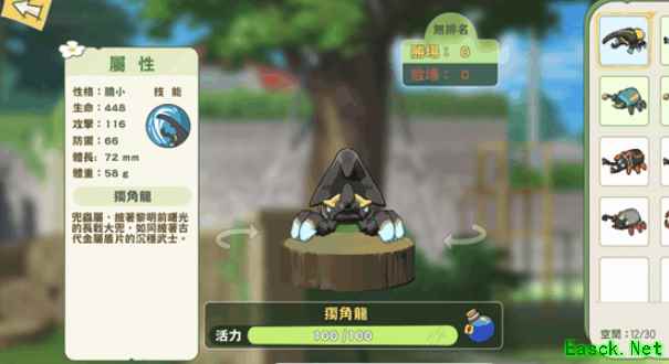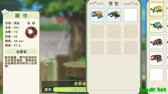 发现虫点后点击捕虫网就可以捕获虫点中的甲虫,稀有虫点中的甲虫属性更好呦。抓住甲虫后玩家可以查看甲虫的品种、性格、攻击力等等。每个地图出产的甲虫品种不同,玩家可以在地图界面中查看该地图出产的甲虫品种。