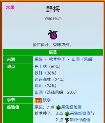 星露谷物语中玩家们在游戏前期最主要的工作,在森林或草原中采集到的水果是玩家们前期下矿的重要食物。其中野梅以不错的回复效果和价值。成为了玩家们的采集重点。那么今天小编就为大家带来一期野梅的获取方法介绍。 野梅获取方法 1、采集:玩家们可以在森林、深山、巴士站、铁路、山洞等区域采集到。 2、种植:种植秋季种子也有几率种出野梅。 3、在秋季翻动垃圾桶也有概率找到野梅。 野梅属性 能量+25、生命值+11 可以制作为葡萄干布丁、酒、紫色燃料。