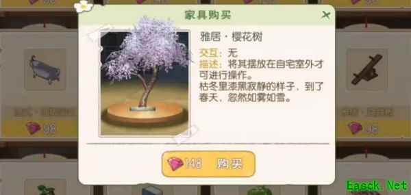 《小森生活》樱花树获取攻略【获取攻略】 1、首先玩家打开商城,切换到家具购买页面,选择最竖排最后一个小图标,然后将页面往下翻就可以找到樱花树了; 2、樱花树的售价是148个钻石,购买后可以摆放在自宅的室外,非常好看,玩家们可以搭配其他建筑放置。