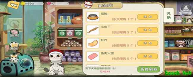 毛球可以在宠物店的“兑换”分类内兑换猫碗和小鱼干、虾片、鱼肉火腿、猫布丁等猫粮。玩家可以前往海街找到NPC薰对话打开宠物店界面,然后点击右边的“兑换”切页进入兑换界面;也可以通过宠物抚摸界面左下角的“兑换”按钮直接打开兑换界面。