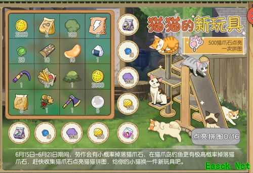《小森生活》猫猫的新玩具活动介绍【活动介绍】 6月15日停机维护完成后-6月21日23:59 活动期间,村民通过砍树、采集、采矿、钓鱼和收割等日常操作,就有机会获得猫爪石道具~ 收集到一定数量的猫爪石即可在活动界面上点亮猫猫拼图,获得奖励。当点亮的拼图区域连成直线时,即可获得相应位置的连线奖励,包括金贝壳、晴奈特制饮品、紫毛球等;当整个拼图都点亮时,还可获得最终大奖——猫爬架!快收集猫爪石参加活动,给你的小猫咪换一件新玩具吧!