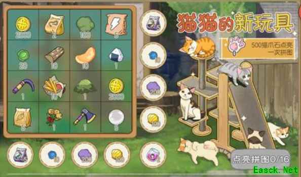 《小森生活》猫爪石兑换介绍【兑换方法】 1、在右上角活动界面打开“猫猫的新玩具”活动页面,即可消耗猫爪石点亮拼图了。 2、总共有16块拼图,每块拼图需要500猫爪石才能点亮。 3、总计需要8000个猫爪石可以获得所有奖励。