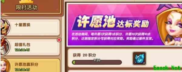 放置奇兵许愿池一般是在限时活动中,点击屏幕右上角的限时活动图标,找到许愿池赢积分活动的图标,可以进行抽奖。许愿池内抽奖一次获得1点积分,达成指定积分可以获得奖励。需要注意的是,许愿池抽奖需要用到许愿币,许愿币需要用到大量钻石去市场购买,获得足够的许愿币之后就可以点击许愿池进行抽奖了(连抽10次可以节省2个许愿币)。