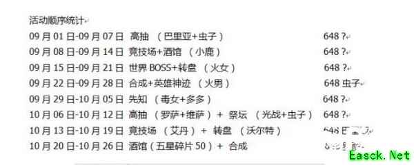 放置奇兵每周活动顺序:高抽、竞技场+酒馆、世界Boss+转盘、合成+英雄神迹、先知。放置奇兵的活动顺序都是按顺序轮换的,有时候可能会有俩个前后颠倒,不过整体顺序是不会变的。