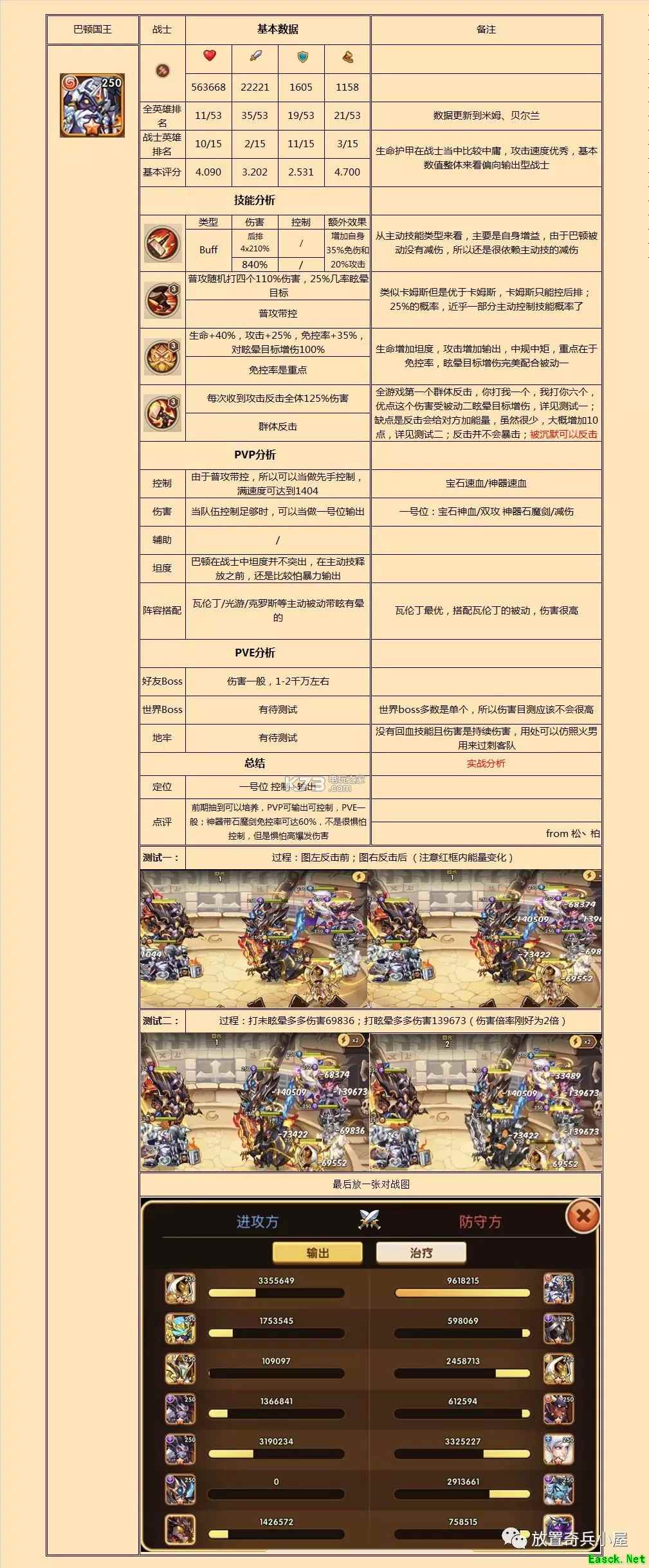 国王技能介绍: 一技能:后排伤害210%,伤害比较可观,可以配合卡姆斯、克罗斯、暗刺这些打后排的英雄,加上光游、克里姆这些单点血少的,秒后排应该很给力。加免伤很高,这是老巴爸爸能站住的资本,加20%攻击也能锦上添花。 二技能:非常强力,总伤害500%,加上平均每次眩晕一个人2回合,有伤害有控制。 三技能:加面板属性的就不说了,免控加35%很可观了,加上最配神器石魔剑,一个字:稳!对眩晕目标增加伤害可以配合光刺、瓦伦丁,不热门的有沃尔特这些就不提了,以后肯定会出更多眩晕英雄,毕竟数量不多。 四技能:初始阶段不少人的情况,挨一次打可以提供总伤害750%!如果对面都是打一号位的,那第一回合就能造成伤害4500%!吊炸天有没有!而且挨技能也可以回击。 属性、PVE、PVE详解