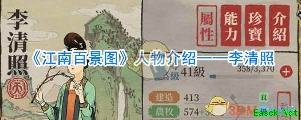 李清照是手游江南百景图中的特殊NPC之一,作为游戏角色李清照在江南百景图中的表现怎么样呢?感兴趣的小伙伴快来一起看看《江南百景图》人物介绍——李清照的相关内容吧。 全角色图鉴大全:点击查看