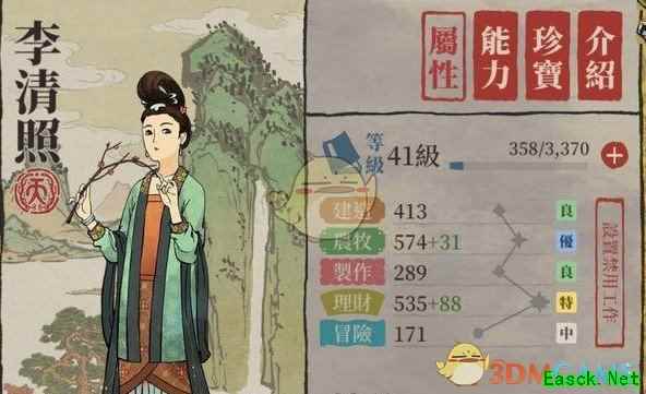 《江南百景图》人物介绍——李清照天赋: 才女——在【理财】建筑(不包含书局) 工作增加金币收入50%,且工人需求-1。 偏【理财】、【农牧】、【建造】取向,最初游戏一开始的天系角色中的唯一女性角色。也是目前唯一【理财】为主的天系女性角色。 这比较推荐在苏州(后期)药铺、画室或是水井赚钱,偶尔也可以帮忙种一下农作物。 推荐法宝: 得太极图(主要提升理财)最合适了!其次是湖神石、啸天犬、孝头髻(以上三项主要提升农牧)。
