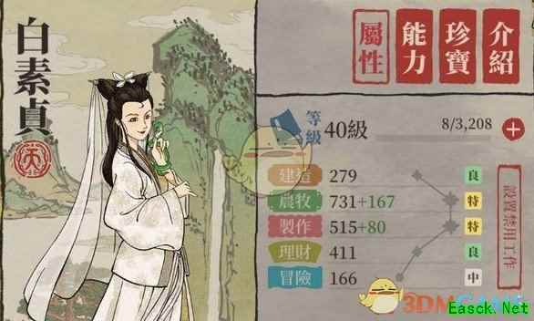 《江南百景图》人物介绍——白素贞天赋: 森蚺——在【锯木厂】工作时,省下原木材料60%,且工人需求-1。 有专属天系法宝:孝头髻(使白素贞多一种天赋)。 偏【农牧】、【制造】、【理财】取向。 如果可以的话最好要搭配专属天系法宝,因为不但会直接增加【农牧】和【制造】基本数值,还可以多一种天赋(视仓库中的纸和木板剩余数量来决定要制造纸还是木板)。 天赋有点像杜丽娘进阶版,天赋局限性较大,要跟木头有关的。 推荐法宝: 可以的话最好是孝头髻,但如果没有的话可以选择湖神石、啸天犬(以上两项主要提升农牧))或是缚龙索(主要提升制造)。