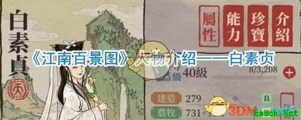 白素贞是手游江南百景图中的特殊NPC之一,作为游戏角色白素贞在江南百景图中的表现怎么样呢?感兴趣的小伙伴快来一起看看《江南百景图》人物介绍——白素贞的相关内容吧。 全角色图鉴大全:点击查看