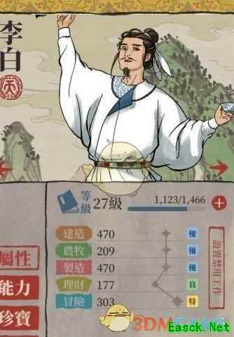 《江南百景图》人物介绍——李白天赋: 云游——探险时采集任何东西直接减少体力消耗8点。 目前天系中最强的冒险平均型角色,四围(建造、制造、农牧、冒险)都颇高。 出得厅堂(探险)入得厨房(农牧、制造及建造),应该是可以说目前天系中最大奖。 天赋有点像阿朵进阶版(但阿朵只能采植物系列才会减少消耗7点体力)。 推荐法宝: 啸天犬、湖神石、孝头髻(以上三项主要提升农牧)、打神鞭(主要提升建造)、缚龙索(主要提升制造)、风火轮(主要提升冒险) 都不错。