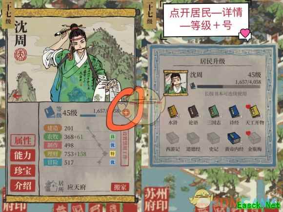 《江南百景图》居民读书攻略在江南百景图手游中,给居民读书是提升居民书籍经验的重要方法,书籍可以通过书局获取或是在杂货摊使用友情点兑换。 点开居民——详情——经验+号——选择书籍就可以了 一、 水浒、论语、三国志、诗经、天工开物 普通书籍经验+100 如果是居民偏爱书籍带红心的,经验+200 二、 西游记、道德经、史记、黄帝内经、金瓶梅 普通书籍经验+1000 如果是居民偏爱书籍带红心的,经验+2000