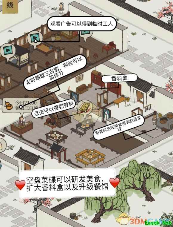 《江南百景图》客栈玩法攻略客栈是游戏中的重要玩法之一,因为餐馆作为税收铜钱来源之一,也是厨艺活动大赛的入口。 1、客栈是个后期玩法,后期满级以后可以卖香料挣钱。前期的客人经常会要一些你还没有解锁的材料,遇到就看广告撵走他。 2、客栈老板娘每天三次定时送三白酒,一个酒加探险体力50。 3、客栈外边每天会有小乞丐,看一次广告给3补天石,每天可以看三次。 4、客栈二层楼是看广告招聘临时工人的地方,看一个广告增加一个临时工人,具体持续多久未知,因为基本不要临时工…… 5、官方偶尔会有厨神大赛活动,要求餐馆至少2级