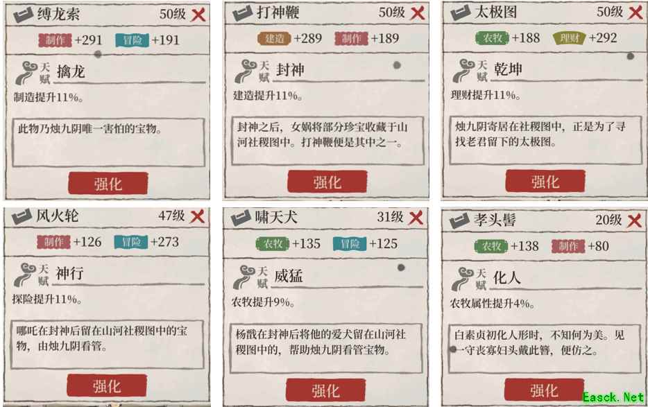 《江南百景图》珍宝系统攻略一、珍宝强化方法 在游戏江南百景图中,珍宝系统是提升游戏中特殊居民属性的重要道具,和特殊居民一样珍宝也分为天/侯/卿三个级别。 珍宝的等级上限是50级,需要通过强化不断升级。在珍宝到达10/20/30/40级时需要突破才能继续升级,突破需要消耗一个相同珍宝以及大量铜币(2万)才能突破。 强化材料主要来自于西域商人和土行孙等,而土行孙更是天机珍宝的主要来源。 强化材料有金/银/铜矿锭,强化经验分别加1000,100,10。也可以用珍宝强化,天/候/卿级珍宝分别加强化经验1000,100,10。