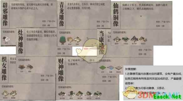 《江南百景图》雕像摆放攻略雕像摆的好,金币少不了,雕像摆放位置可以很大的提升建筑的收益,在前期布局中必须合理的利用好每一寸土地,那么雕像的摆放就显得至关重要了,如何既不占用其他产出建筑的土地,又要带来产量加成。 在游戏前期,建筑摆放以雕像为主,可以事半功倍。 商业雕像目前比较鸡肋,随意摆放即可。 在游戏后期,资源比较富裕,怎么摆放看个人爱好。 每个雕像都有祝福格子提示,只要建筑占用至少一个格子即可生效,不用把建筑全部放在格子里边。