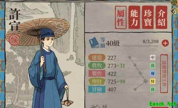 《江南百景图》人物介绍——许宣许宣是目前整个侯系角色中含着金汤匙出生的。 不只长得一表人才,五围的基本数值并没有太低,是【伪】侯系角色。(其实是【真】天系角色。) 虽然天赋跟李师师一样只能在固定工作场所里工作,亦只能拿到同样的物品,但大家要知道现在游戏赚钱主要来源其中之一就是药铺,所以许宣在药铺打工时不但有钱可拿,还有多余草药可以打包回去。 但是这游戏要盖药铺的话,要先达到25等,如果是新手的话可能没办法这样。所以如果是新手拿到这角,个人是建议快点冲等,然后赶快盖书局,再请他去书局买书,你们会发现新世界(买书CD大幅缩短) 。(前提要确保有充足奴仆人力资源来护送这天下第一美男子买书。) 也可以派他去应天的水井工作。就算不做【理财】有关工作,其他四围的基本数值并不低,也可以去支援其他工作。(有李白的即视感...。) 而且,有很重要的一点要说,许宣在前期的基本【理财】数值是赢过天系角色身为「才女」的李清照! 但是,优势大约会在46-48等级左右被反超追过去,官方终究还是偏爱天系角色,天系角色升等给的基本数值比侯系角色高很多! 推荐法宝: 一定是非要太极图(主要提升理财)不可!