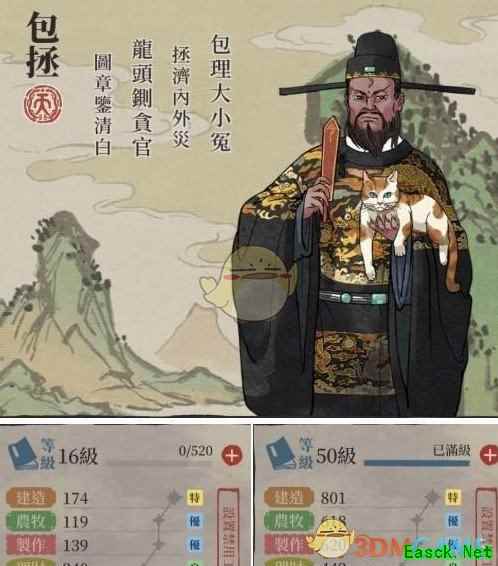 《江南百景图》人物介绍——包拯天赋: 公正——在做【建造】工作时,消耗的物资材料减少30%,但建造时间增加10%,工人需求-1。 平均型角色,五围应该也跟常遇春差不多。但还是建议以【建造】、【制造】、【农牧】为主。 天赋对我来说个人是无感的,毕竟现在后期物资大致不会缺(大概都缺钱),这角应该可以说算是前期角色。 推荐法宝: 个人是觉得打神鞭(主要提升建造)最合适!其次是缚龙索(主要提升制造)、湖神石、啸天犬、孝头髻(以上三项主要提升农牧)都可以。