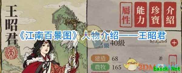 王昭君是手游江南百景图中的特殊NPC之一,作为游戏角色王昭君在江南百景图中的表现怎么样呢?感兴趣的小伙伴快来一起看看《江南百景图》人物介绍——王昭君的相关内容吧。 全角色图鉴大全:点击查看