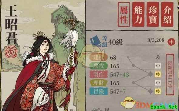 《江南百景图》人物介绍——王昭君天赋: 远嫁——外出探险时候减少粮草消耗。 偏科超级严重的天系角色,专精于【冒险】和【制造】取向。 技能天赋个人是觉得可以说可有可无,也许在以后出冒险探索类型大活动会显现出价值也说不定。但颜值倒是在目前天系女性中数一数二的好。 推荐法宝: 风火轮(主要提升冒险)、缚龙索(主要提升制造)都不错。