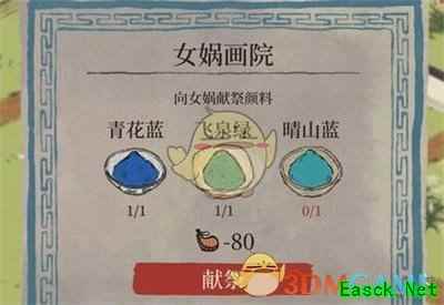 2、材料作用 晴山蓝在作用上主要是为了女娲书院的女娲献祭。 其中,玩家需要找到青花蓝、晴山蓝以及飞泉绿,如此献祭即可轻松完成任务。 以上就是本期关于《江南百景图》晴山蓝获取方法的全部内容了,要想获取更多游戏资讯请点击关注手游网。 |
