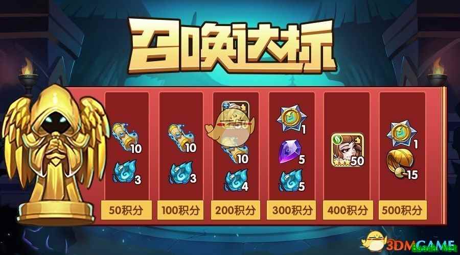 若获得了新英雄格洛丽亚(包括高级召唤和五星碎片召唤),还将获得一套橙色三星装备。 同时,在活动期间使用英雄召唤卷轴可获得积分,当积分达到指定数额,可通过邮件领取对应奖励。