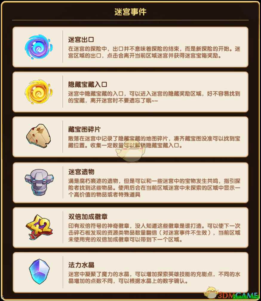 秘银镐获取方式: 活动周每日邮件、钻石购买、活动礼包,迷宫冒险过程中也有几率获得秘银镐哦~ 迷宫事件共有6种,具体如下: