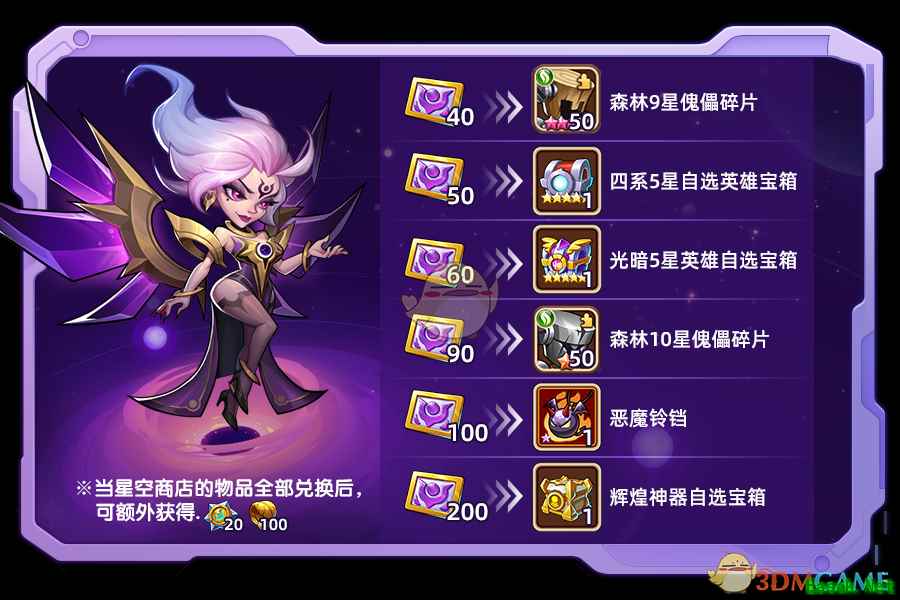 活动期间,通过【杰赫拉的邀约】获得的名片卡,可在星空商店兑换如图物品。 若星空商店的物品全部被兑换,还将额外获得:时空核心x20,辉煌圣物x100! 除两种英雄自选宝箱限兑换2次以外,其余物品限兑换1次; 英雄宝箱内容与辉煌圣殿同步; 辉煌神器自选宝箱不包含冰雪之心。 以上就是小编整理带来的《放置奇兵》杰赫拉的名片卡作用介绍,大家还喜欢吗?更多精彩内容,请点击关注手游网,小编将持续为您更新! 本文内容来源于互联网,如有侵权请联系删除。 |