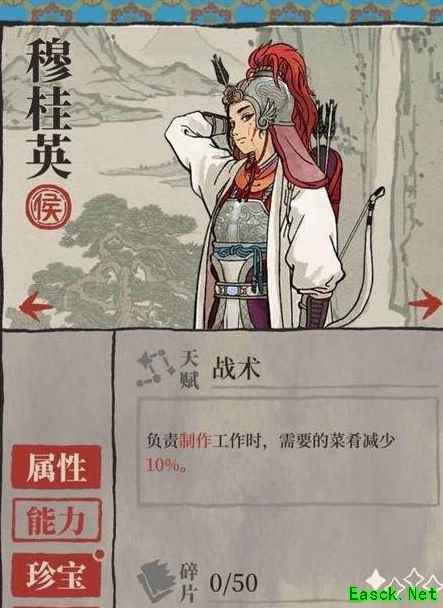 《江南百景图》人物介绍——穆桂英天赋: 战术 在做制造工作时候,如果要消耗饭的话直接省10%饭。 跟玄奘一样是属于特殊平均型角色,只是是弱化版。 但是穆桂英除了制造这一项较突出,其他三围较平均,理财较偏低。 天赋局限性超大,只能做跟制造有关的工作。 虽然餐馆是属于制造向工作,但是因为不会消耗饭,所以天赋也不会触发。 建议可以跟玄奘一样去苏州开荒,但要注意工作是属于哪种类型。 多做跟制造有关的工作,偶尔也可以支援一下其他工作。 最好不要做理财有关工作。 推荐法宝: 缚龙索(主要提升制造)最合适,其次是啸天犬、湖神石、孝头髻(以上三项主要提升农牧)、打神鞭(主要提升建造)、风火轮(主要提升冒险)都可以。
