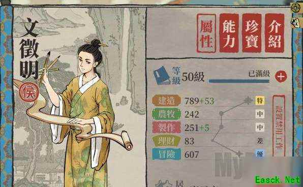 《江南百景图》人物介绍——文徵明天赋: 妙笔 在建造新建筑(这是指盖新的房子或是新建筑,升等不算) ,立即完成30%进度。 在解牡丹亭剧情时候,要注意确保自己有开到开完每剧情地区的宝箱,这样才会有足够碎片可以进阶,进阶后天赋会再多3%,总计33%。 偏建造、冒险取向。也是伪侯系角色。 是目前游戏立即完成进度天赋角色中最高%数的!据说游戏刚开放时候文征明盖新房子或新建筑速度比现在更快更恐怖。 天赋实用性不是那么高,毕竟只能用一次 ,但可以在跟严贪官交换建筑时候,把娱乐建筑都跟严贪官换完后再叫他出来盖刚才交换的建筑。 推荐法宝: 打神鞭(主要提升建造)是比较能配合他的天赋,其次是风火轮(主要提升冒险),但如果要后续效益的话,则是缚龙索(主要提升制造)、啸天犬、湖神石、孝头髻(以上三项主要提升农牧)比较好。