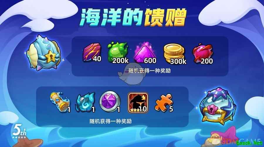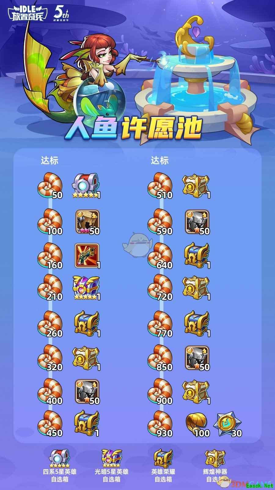 每次许愿可获得1M金币,并有概率获得【海洋宝箱】或者【闪耀海洋宝箱】,该宝箱可在【海洋的馈赠】中打开。 神奇海螺获取方式:龙舟大赛、召唤达标、海之祝福礼包、超值礼包; 所有英雄自选箱:与当期辉煌圣殿同步; 辉煌神器自选箱:所有辉煌神器,包括冰雪之心。 No.3 从【人鱼许愿池】中获得的宝箱,可在海洋的馈赠中打开,开启宝箱必定获得【五周年纪念章】,同时还将随机获得宝箱内的其中一件物品。
