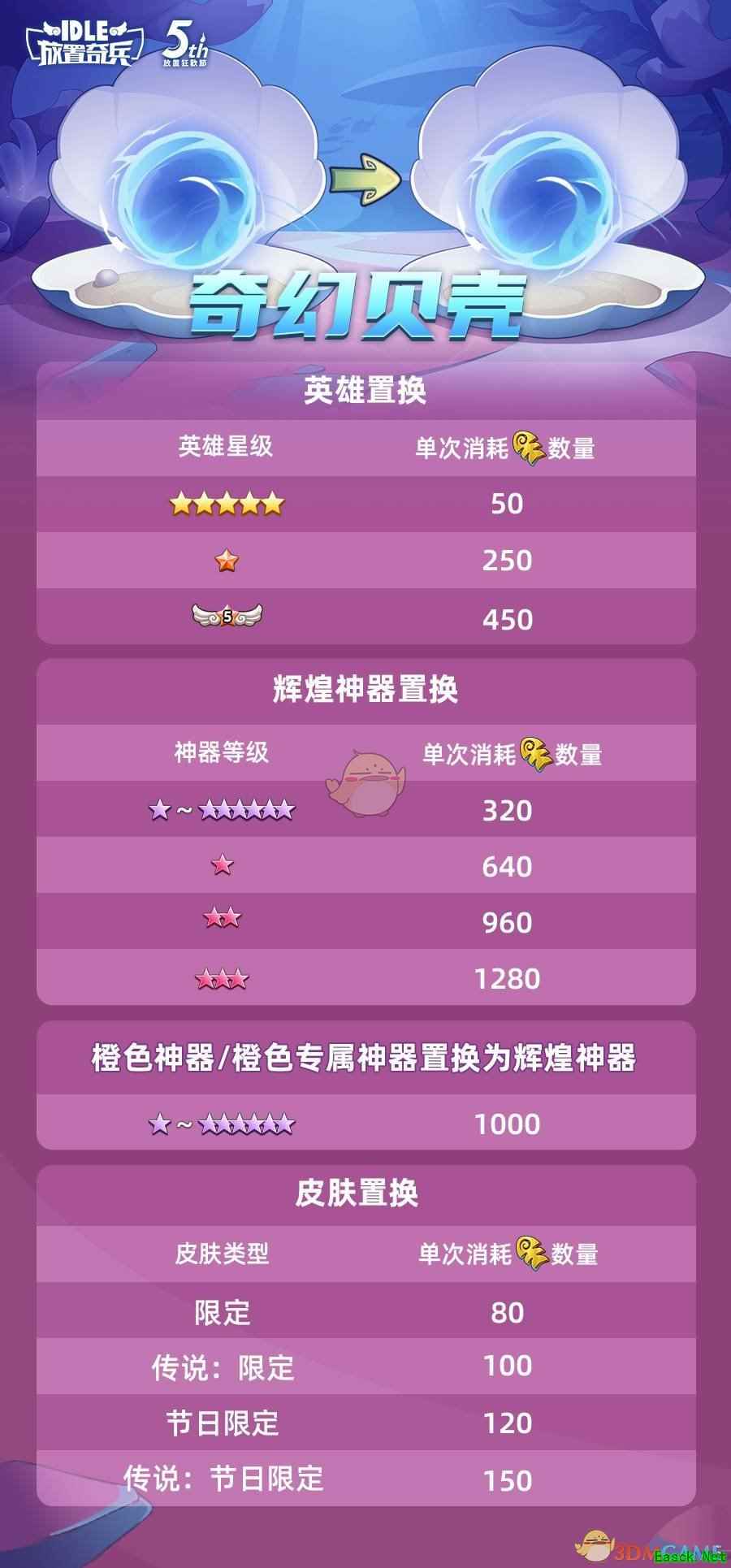 五周年纪念章获取方法 放置奇兵五周年纪念章有什么用奇幻贝壳 活动期间,消耗【五周年纪念章】可将背包中的英雄、皮肤或者神器进行自选置换,详情如图所示。