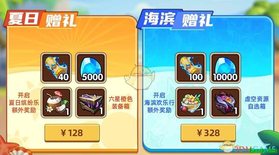 2500VIP积分:豪华四系5星英雄自选箱,包含所有四系初始5星英雄; 5000VIP积分:豪华光暗5星英雄自选箱,包含所有光暗初始5星英雄; 7500/20000VIP积分:辉煌神器自选箱,包含冰雪之心。 4.旅行礼包 活动期间,超值夏日赠礼和海滨赠礼提供购买。