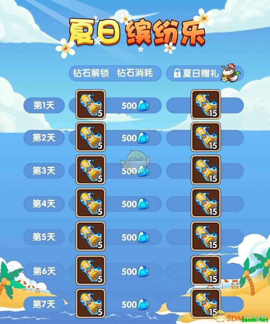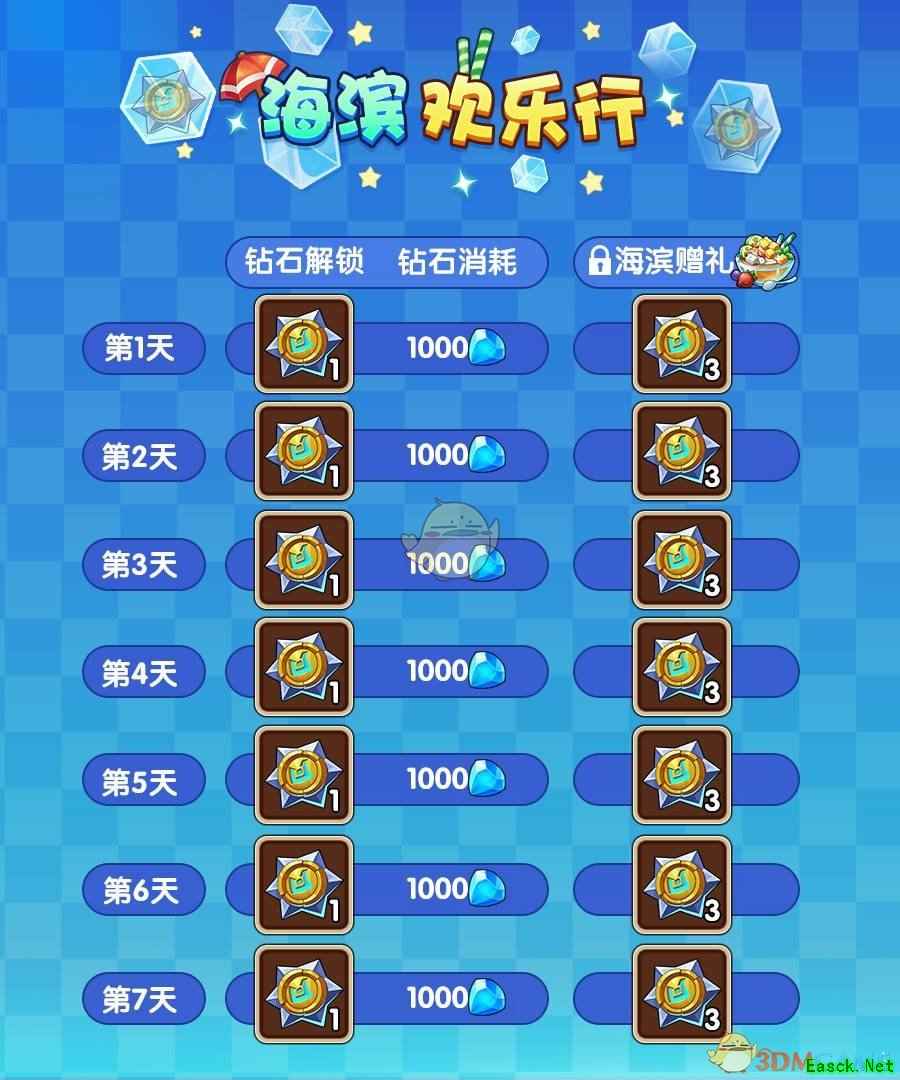 若活动前6天未购买礼物,最后一天也可以购买全部礼物,获得所有奖励。 2.海滨欢乐行 活动期间,海滨欢乐行将每天解锁一份礼物,大家可消耗钻石进行购买。若购买海滨赠礼,还可解锁海滨欢乐行的额外奖励!