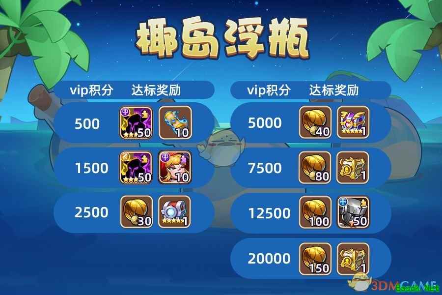 若活动前6天未购买礼物,最后一天也可以购买全部礼物,获得所有奖励。 3.椰岛浮瓶 活动期间,累积获得指定数值的VIP积分即可获得丰厚奖励,详情如图。