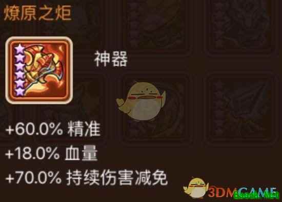+60%精准:火炬60%精准,提高18%输出伤害;+18%血量:和棒棒糖一样,目前限定神器中,加血量加的最多的;+70%持续伤害减免:特殊属性,单一属性伤害减免。