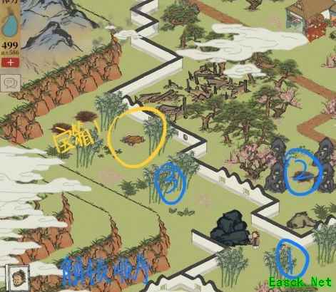 桃花坞的第一个宝箱就在里面 砍掉沿路的竹子有两个桃花树坑需要种上。
