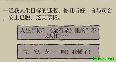 2.我们这个时候不知道该怎么选,接下来就为玩家们解析一下这两个选项的含义和内容; 3.言与司合安上已脱芝芙草拔,意思是四个字言与司合(词),安上已脱(女),芝芙草拔(之夫); 4.合起来就是词女之夫,来源于一个典故,赵明诚做梦的时候梦见了这句词,暗示自己和李清照的姻缘; 5.至于言安芝,是没有什么含义的,玩家们怎么选,都可以,没有具体的影响,完成这段剧情之后,就可以领取补天石奖励了。 以上就是《江南百景图》言与司合安上已脱芝芙草拔解析的全部内容了,更多手游攻略请关注手游网! |