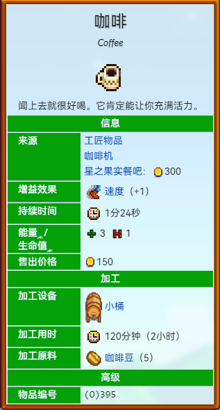星露谷物语中,食物能为玩家提供能量值和生命值,而饮品会为玩家带来一些独特的加成。在游戏中,玩家们探图最常用的就是咖啡,咖啡能提高玩家的移动速度,非常实用。下面为大家带来咖啡的制作教学。 咖啡制作方法 将5个咖啡豆放在小桶中,然后等待120分钟即可制作完成。 咖啡豆获取方法 每周五、周日可在巫师塔右侧的猪车购买咖啡豆。 咖啡豆可种植,在夏季10天成熟,每2天可收获一次,每次收获4颗咖啡豆。