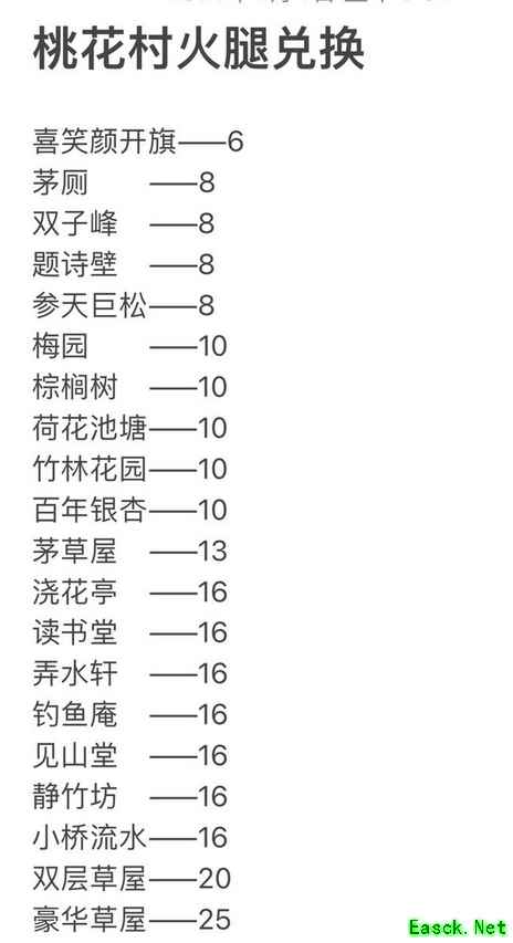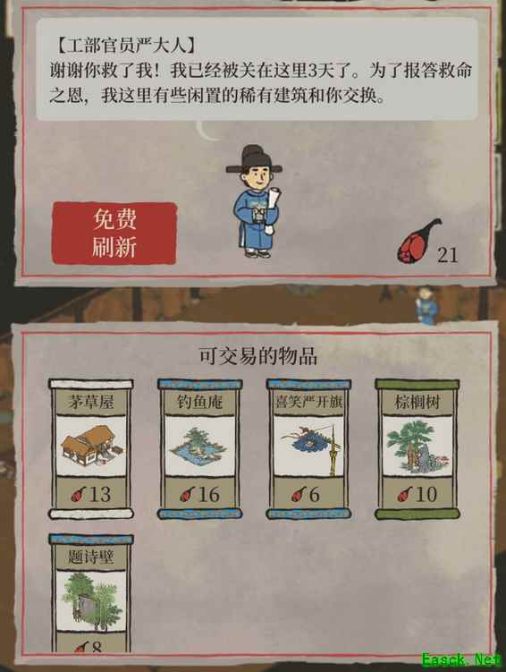 钥匙消耗完之后就可以点击旁边的[严大人]进行建筑兑换了 [另:有一次免费刷新机会 之后每次刷新消耗100补天石] 图8[建筑兑换所需火腿一览表]