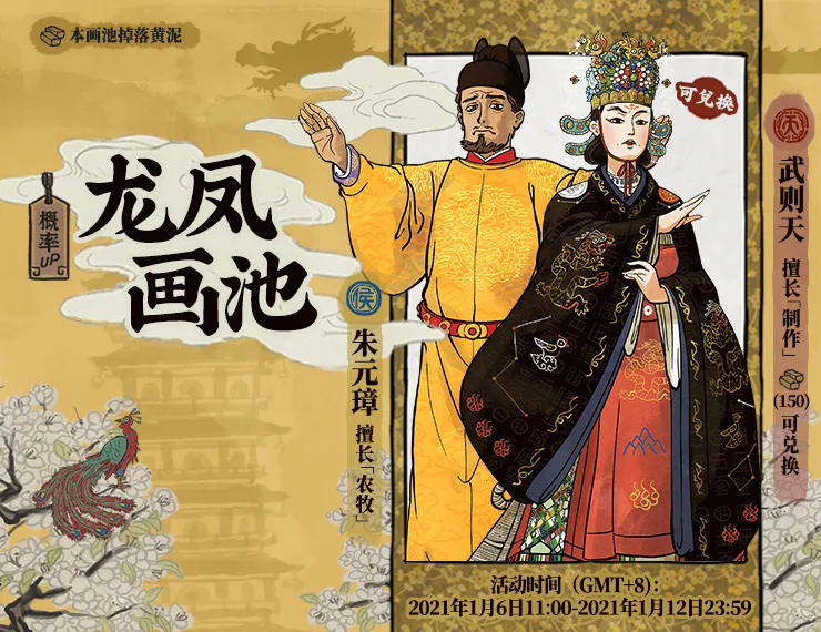 《江南百景图》龙凤画池开启时间介绍一、画池时间 画池UP时间:1月6日11:00—1月12日23:59 天级居民【武则天】&侯级居民【朱元璋】共同进入【龙凤】画池。