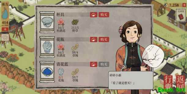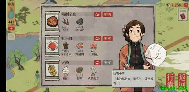 3、【丽娘府宅】 店铺售卖:同心纸、松烟墨、huo药;好吃果子、飞泉绿、晴山蓝;杯具、花瓶、青花蓝;嫁衣、牡丹红。 野草、野猪 梨树、枫树、皂荚树、松树、柳树 普通花丛、牡丹花丛、杜鹃花、百合花丛 铁矿、顽石、黑石、巨石 稻田、棉花田、水井 店铺1(书院)