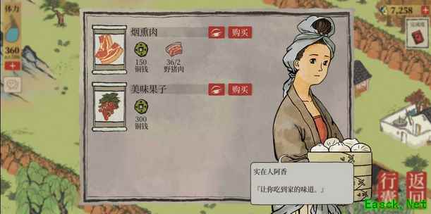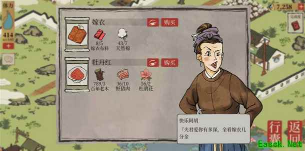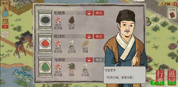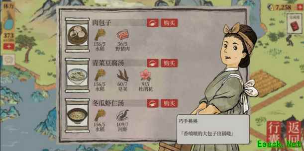 2、【应天城郊】 店铺售卖:肉包子、青菜豆腐汤、冬瓜虾仁汤;松烟墨、牡丹红、飞泉绿。 野草、野猪 稻田、鱼塘、棉田 铁矿、黑石、顽石、巨石、丑石 普通花丛、杜鹃花、牡丹花丛、百合花丛 皂荚树、柳树、松树、枯树、竹、枫树 店铺1(餐馆)