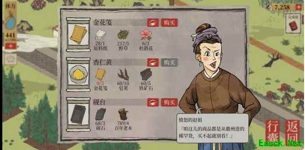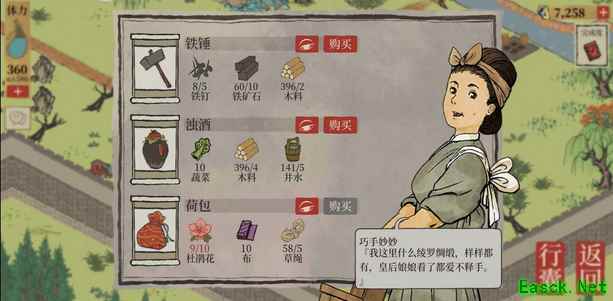 应天府探险资源一览1、【秦淮河畔】 店铺售卖:精制皂角、牡丹红、huo药;金花笺、杏仁黄、砚台;铁锤、浊酒、荷包;烟熏肉、美味果子。 野猪、野草 柳树、枯树、皂荚树、枫树 普通花丛、杜鹃花 巨石、黑石、铁矿、顽石、丑石 农田、纸浆池、杂乱的衣服、水井 店铺1(画室)