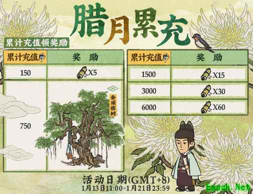 活动时间:1月13日11:00—1月21日23:59 活动期间内,累计充值满150补天石,即可领取【金画轴*5】 活动期间内,累计充值满750补天石,即可再领取全新建筑【垂须榕树*1】 活动期间内,累计充值满1500补天石,即可领取【金画轴*15】 活动期间内,累计充值满3000补天石,即可领取【金画轴*30】 活动期间内,累计充值满6000补天石,即可领取【金画轴*60】