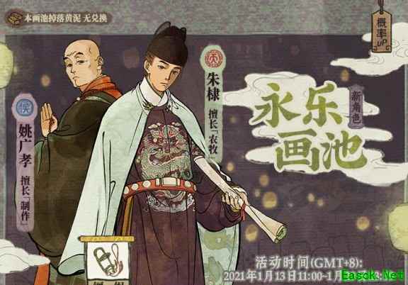 《江南百景图》永乐画池介绍一、上线时间 2021年1月13日11:00永乐画池上线!2021年1月29日23:59下架。 二、卡池介绍 天级新角色【朱棣】及其专属珍宝【缰绳】&侯级新角色【姚广孝】共同进入【永乐】画池。 活动期间【朱棣】、【姚广孝】概率UP!抽到天级和候级角色获得新角色的概率增加! 每次抽奖需要消耗一个金画轴,十连保底一个候级角色。