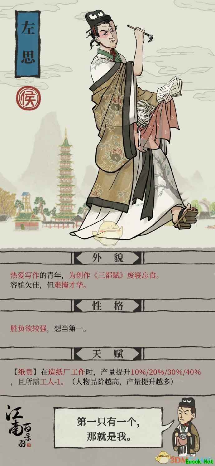 《江南百景图》左思珍宝选择推荐珍宝搭配推荐: 缚龙索、镇河铁犀、青铜爵、盘盏、旗 等级: 候阶居民 属性: 暂无 天赋: 【纸贵】在造纸厂工作时,产量提升10%/20%/30%/40%,且所需工人-1。(人物品阶越高,产量提升越多)