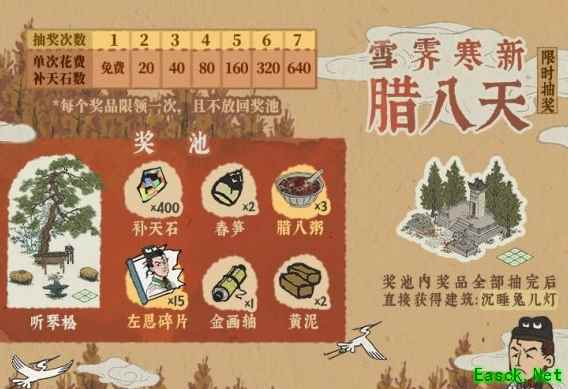 《江南百景图》雪霁寒新腊八天奖池一览一、奖品介绍 金画轴*1、春笋*2、黄泥*2、补天石*400、腊八粥*3、听琴松*1、左思碎片*15。 奖池内奖品全部抽完后直接获得建筑:沉睡兔儿灯。 二、玩法介绍 活动时间:1月19日11:00——1月26日23:59 活动期间内,前往州府内公告处,可以参与限时抽奖活动! 奖池内奖品限领1次,抽到的奖品会从奖池中剔除,不会被重复抽取。 三、抽奖计算 第一次抽奖为免费抽取。 第二次抽奖花费补天石*20颗。 第三次抽奖花费补天石*40颗。 第四次抽奖花费补天石*80颗。 第五次抽奖花费补天石*160颗。 第六次抽奖花费补天石*320颗。 第七次抽奖花费补天石*640颗。 抽奖7次共需花费补天石*1260颗。 全部抽完后可直接领取额外大奖:沉睡兔儿灯*1个。 具体奖池详情请知府大人们查看下方配图。
