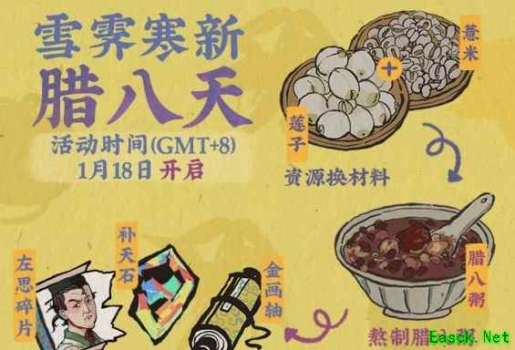 此次腊八天系列活动将分为收集食材、熬制腊八粥、兑换福利三个过程。 二、活动日程 1月18日至1月25日,知府们可通过州府内资源兑换收集食材【薏米】;